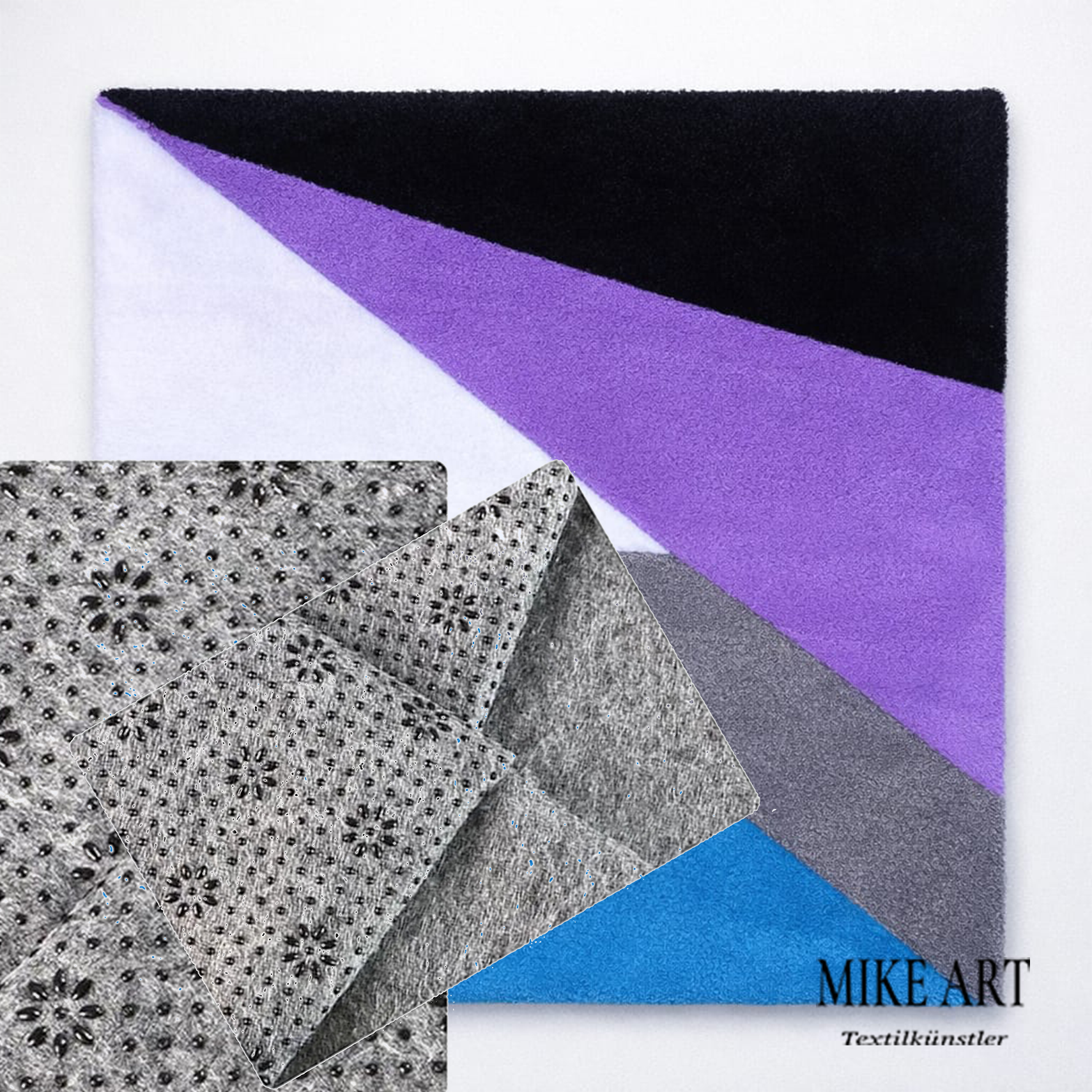 Der handgefertigte Tufting Teppich „Geometrie“ vereint reduziertes Design mit präziser Handwerkskunst. Klare Linien, kraftvolle Farbflächen in Schwarz, Lila, Weiß, Blau und Grau sowie eine harmonische Komposition machen dieses Stück zu einem modernen Statement für anspruchsvolle Wohnräume.