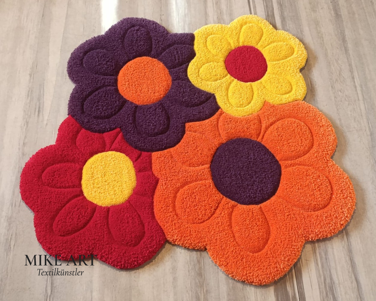 Dieser handgetuftete Blumenteppich vereint vier florale Formen zu einer harmonischen Gesamtkomposition. Die reliefartig herausgearbeiteten Konturen erzeugen eine dezente 3D-Wirkung und verleihen dem Teppich Tiefe sowie eine besonders hochwertige Haptik.